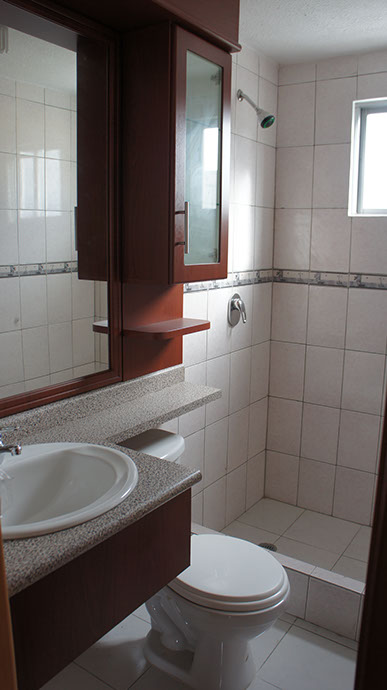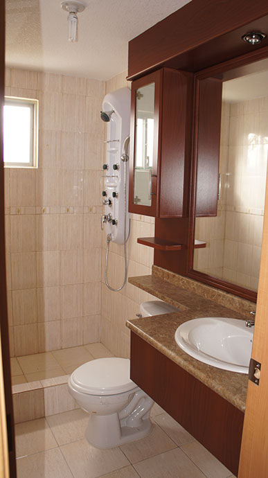 • Muebles de baño, gabinete en MDF termolaminado, luces y espejo